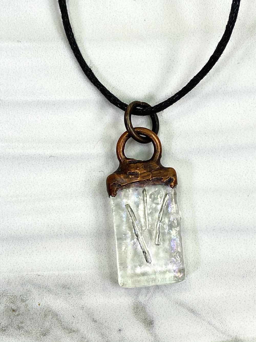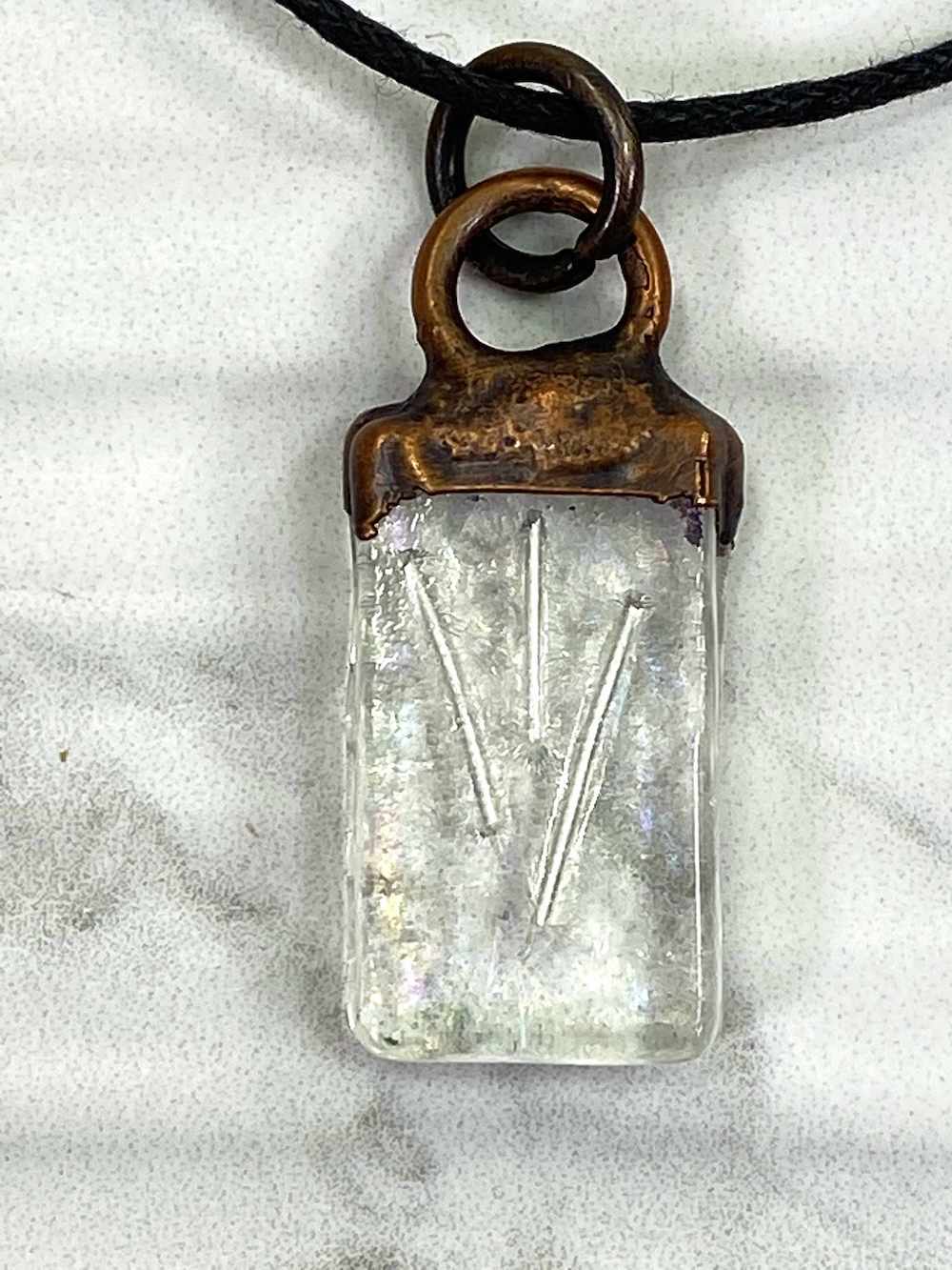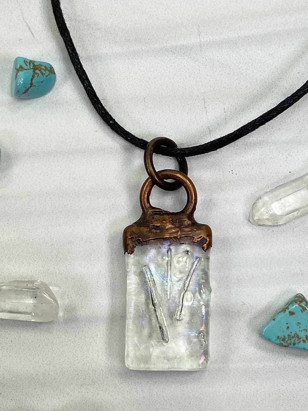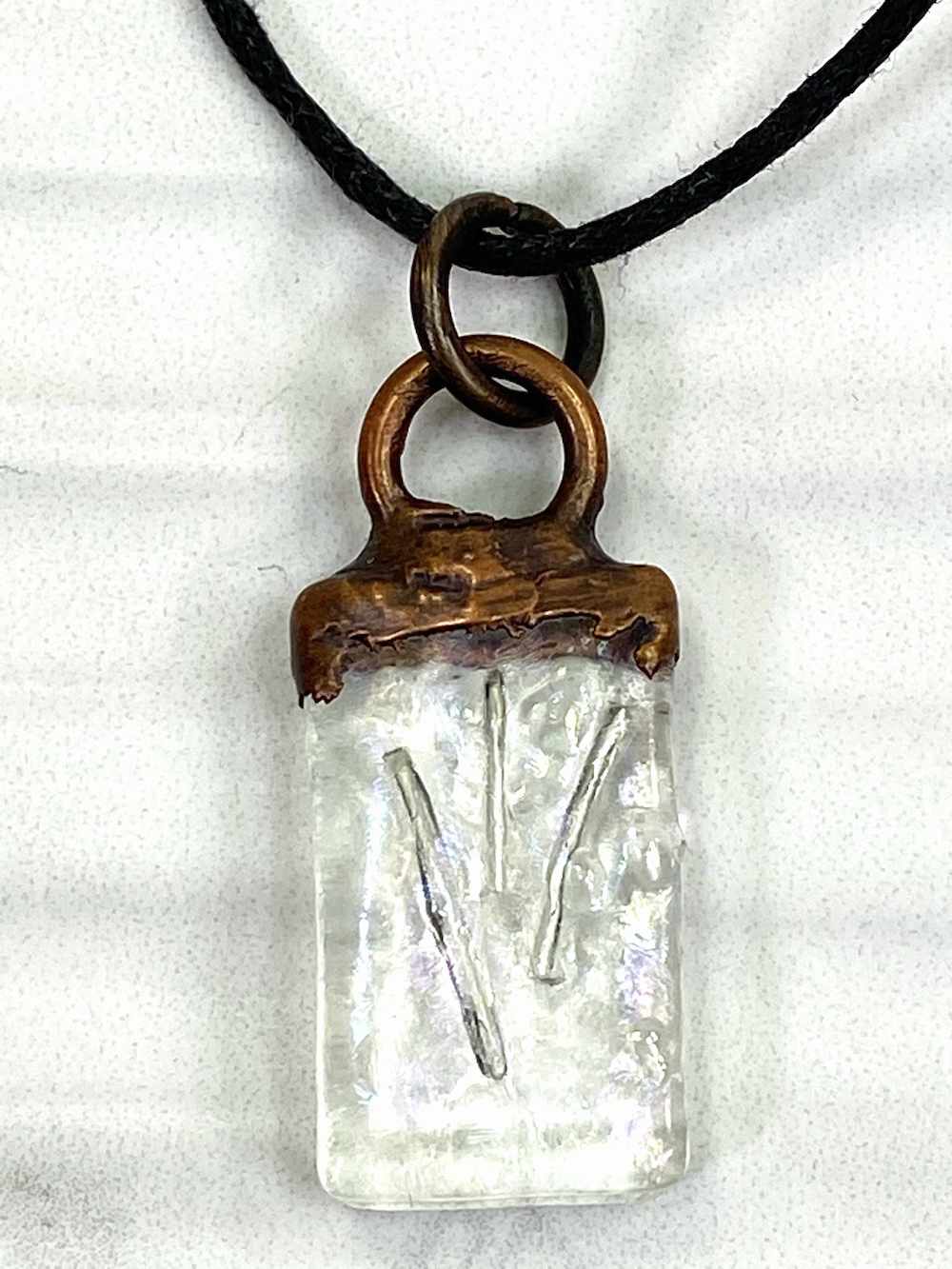 The listing is for one copper pendant with 19″ black cord necklace with .999 Investment Grade Fine Silver Imbedded In Fused Glass, finished with natural patina which results in a raw and more organic look.