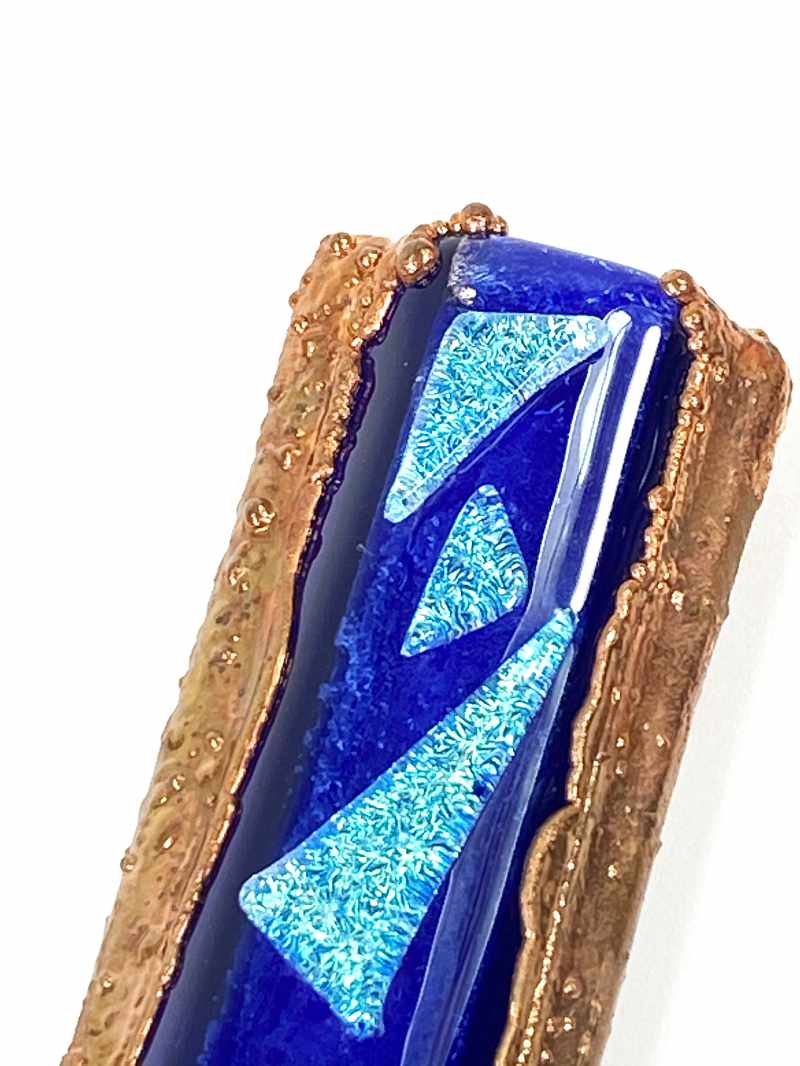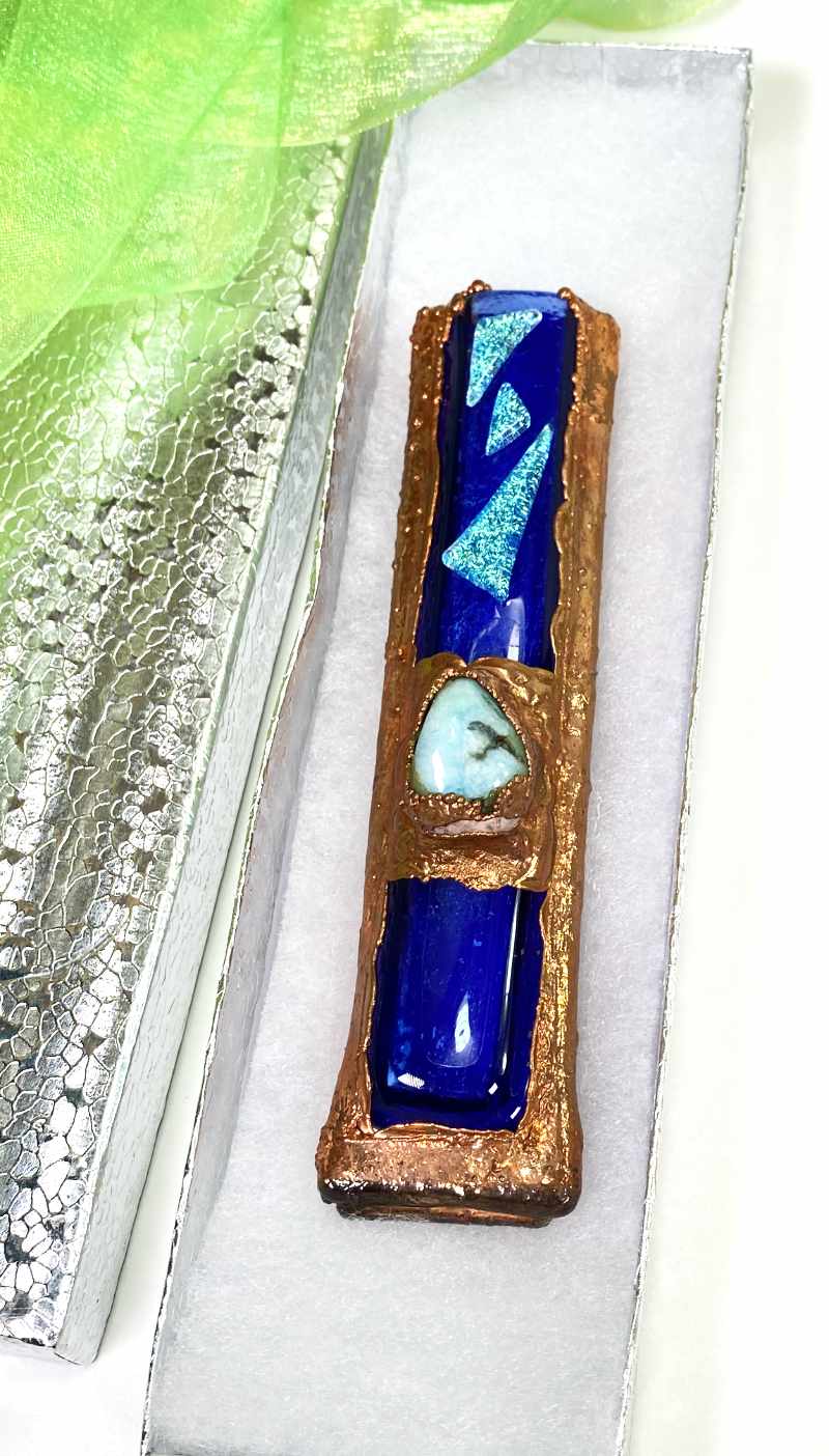 - This Mezuzah case is Handmade with heavy Gauge Copper with Fused Glass Shin.
