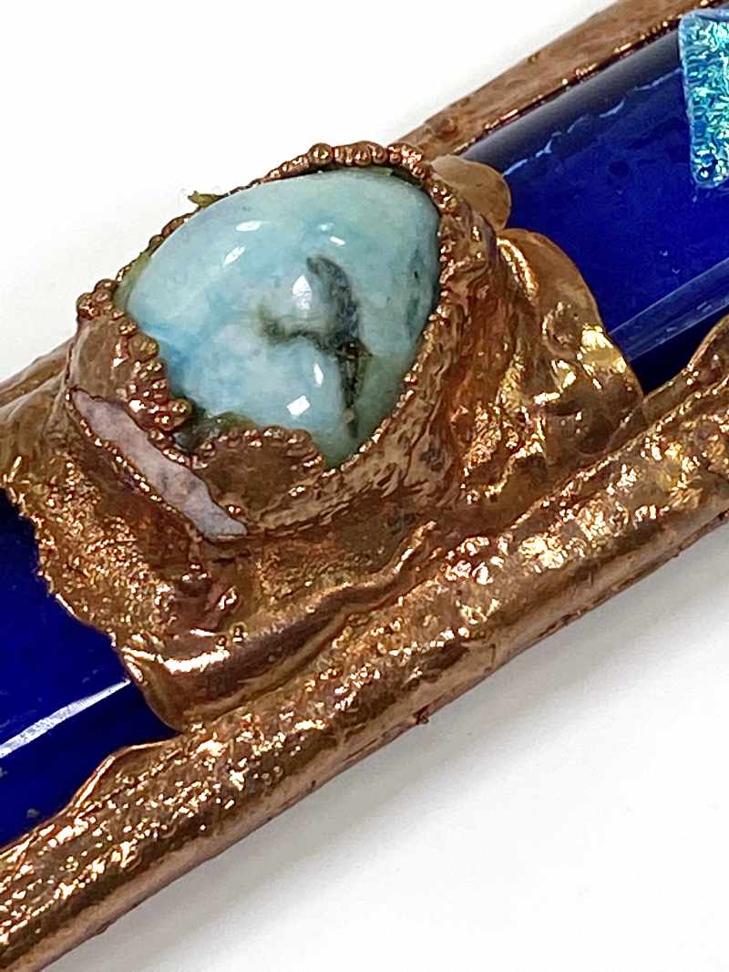 Fused Glass | Copper Inlays | Raw Amazonite Gemstones Mezuzah Case Handmade Blue with Green Dichroic Glass Shin Great for Housewarming, Wedding, Anniversary, or Birthday Gift.