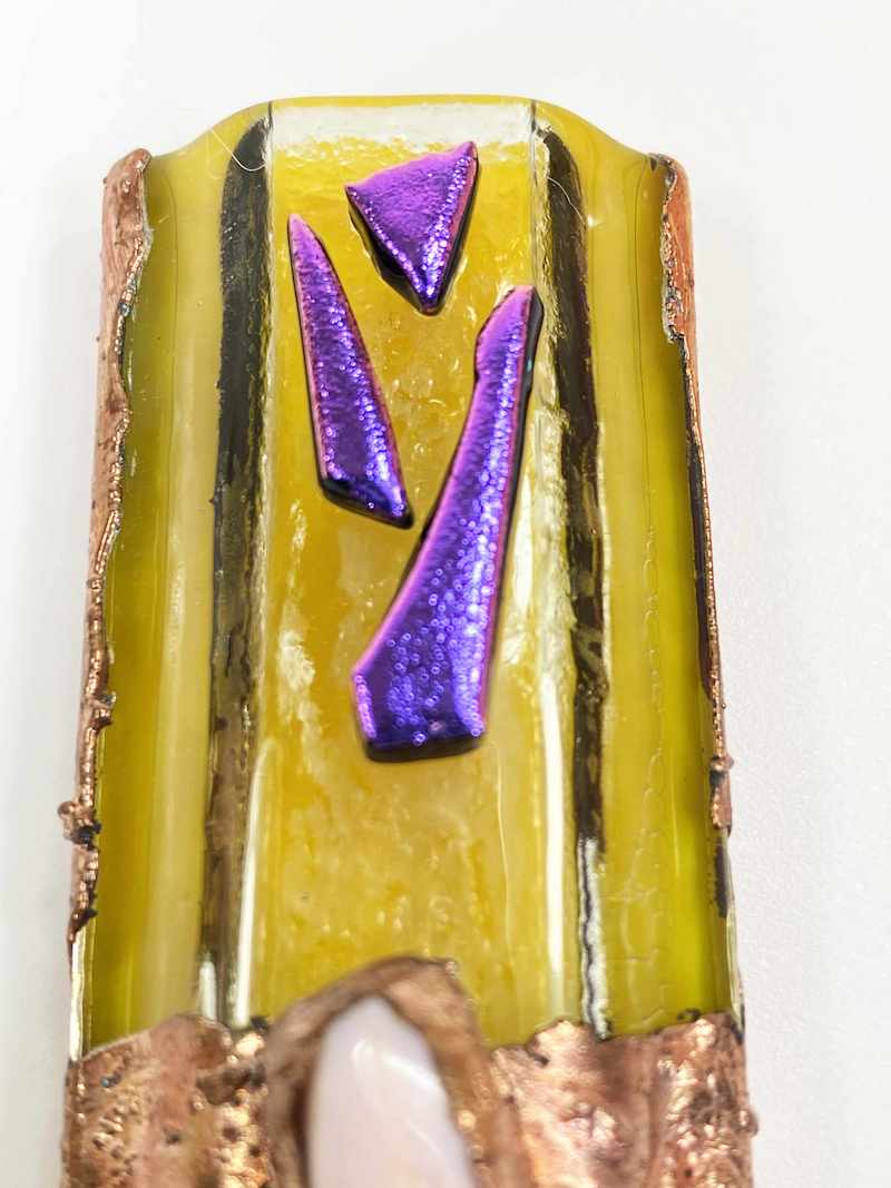 Fused Glass | Copper Inlays | Raw Rose quartz Gemstones Mezuzah Case Handmade Yellow with Purple/Red Dichroic Glass Shin Great for Housewarming, Wedding, Anniversary, or Birthday Gift.
