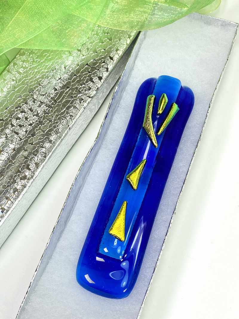 Be the first to review “Fused Glass | Mezuzah Case Handmade Blue with Yellow Dichroic Glass Shin Great for Housewarming, Wedding, Anniversary, or Birthday Gift.”