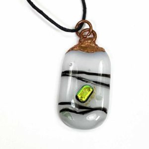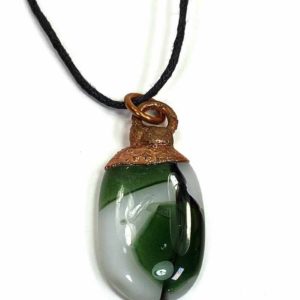 The listing is for one copper pendant with 19″ black cord necklace with Fused Glass, finished with natural patina which results in a raw and more organic look.